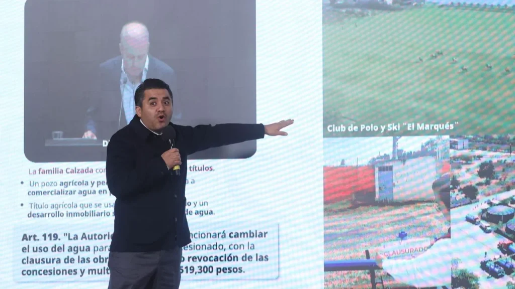 La mandataria federal detalló que la familia del exgobernador de Querétaro, José Calzada, y del diputado federal del PRI, Mario Calzada, tenía concesiones de agua agrícola; sin embargo, con la antigua ley tenían derecho de transmitirlo a otros usos sin reportarlo, por lo que esa agua no era utilizada para producir alimentos, sino a un lugar residencial que tiene un campo para jugar polo o para vender agua en pipa, “mientras la gente que vive al lado no tiene agua”, declaró la titular del Ejecutivo.