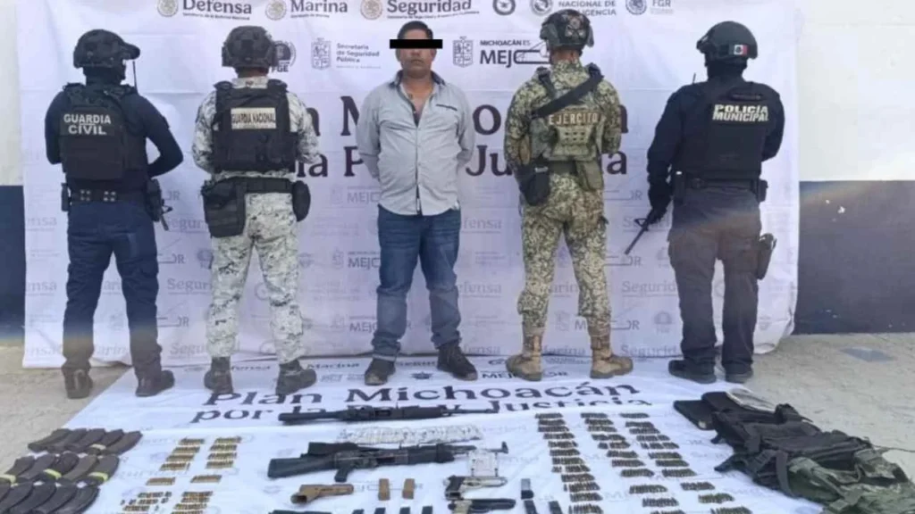 En Tepalcatepec, la Secretaría de la Defensa Nacional arrestó a Víctor Noe “N”, de 35 años, hijo de Juan José ‘El Abuelo Farías’, líder criminal buscado por Estados Unidos.