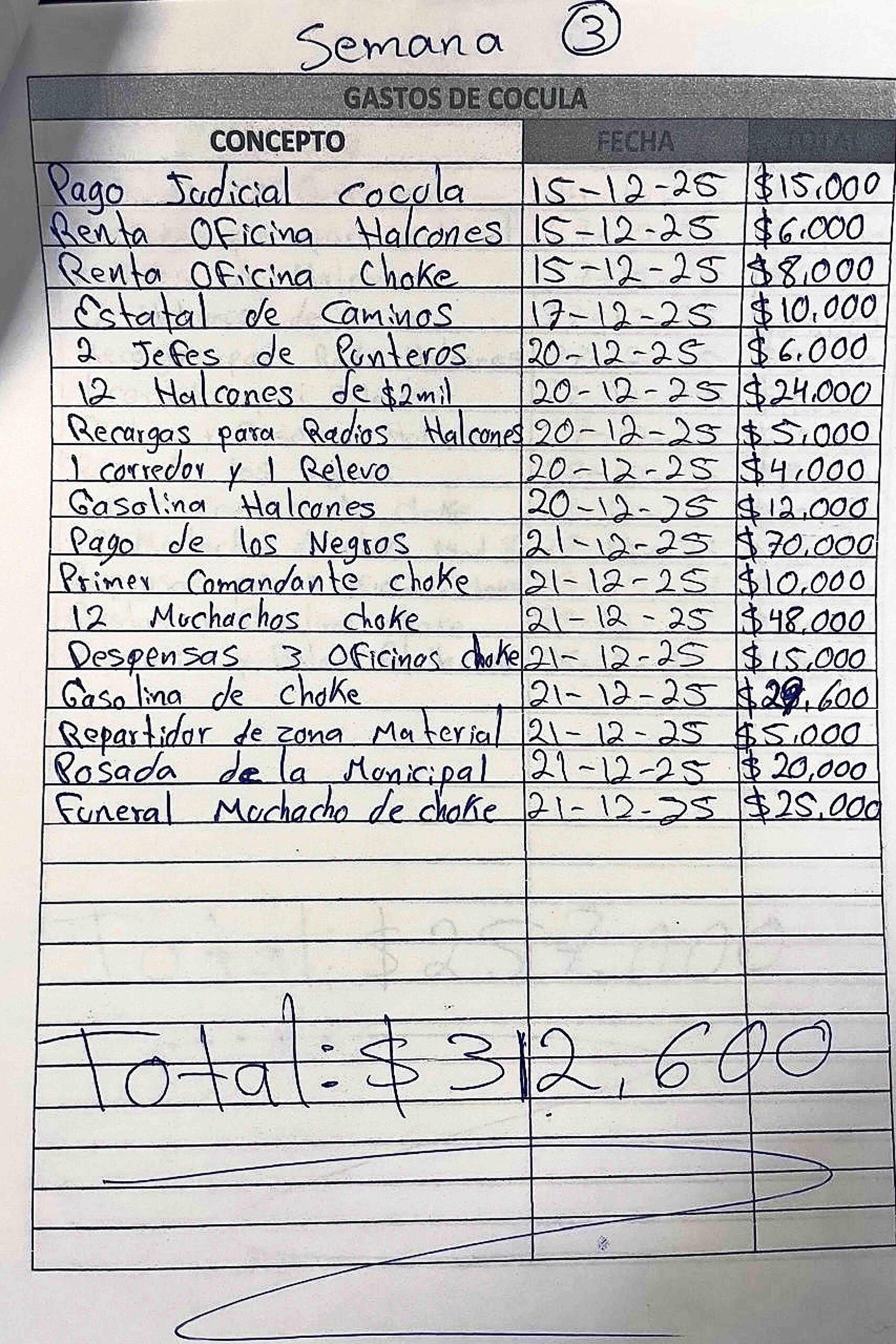 Una erogación de 25 mil pesos por “funeral muchacho de choke [sicario]”, asentada el 21 de diciembre de 2025 en la lista titulada Gastos de Cocula, sugiere que el Cártel Jalisco Nueva Generación paga los servicios funerarios a sus elementos caídos en combate, como una especie de prestación en una empresa.