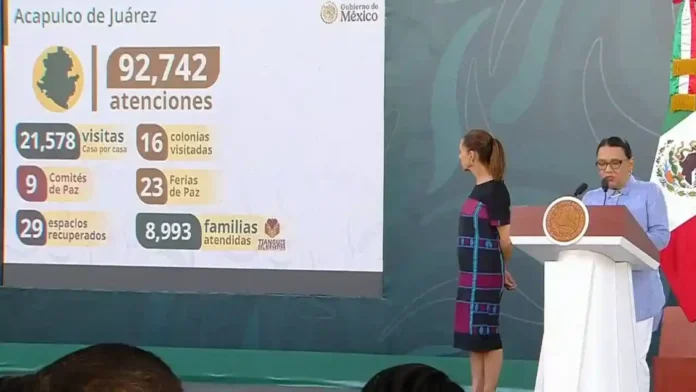 “Hubo dos municipios prioritarios de atención en la entidad, Chilpancingo de los Bravo y Acapulco de Juárez, en los que se desplegó todo un esfuerzo interinstitucional para brindar 186 mil atenciones. Estuvimos ahí en 40 colonias donde realizamos visita casa por casa, se instalaron 29 comités de paz, se efectuaron 50 ferias de paz, se recuperaron en conjunto con la población y autoridades locales 37 espacios públicos y llevamos a cabo tianguis de bienestar”, resaltó.