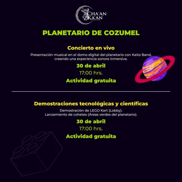 Las actividades se llevarán a cabo los días 25 y 30 de abril e incluyen talleres, proyecciones en domo digital, visitas al observatorio astronómico, observaciones solares, retos de construcción con LEGO, conciertos sonoros en vivo, demostraciones tecnológicas y científicas, el tradicional juego de romper la piñata y veladas astronómicas.