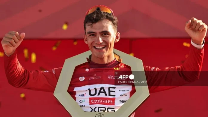 Isaac del Toro celebra su victoria en la cima del Jebel Hafeet tras ganar la sexta etapa del Tour UAE y asumir el liderato de la competencia.