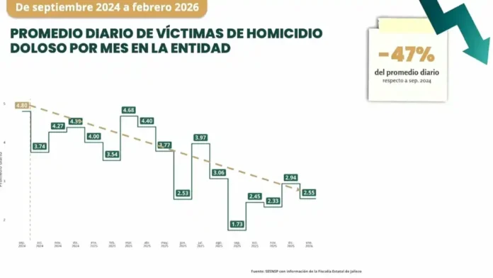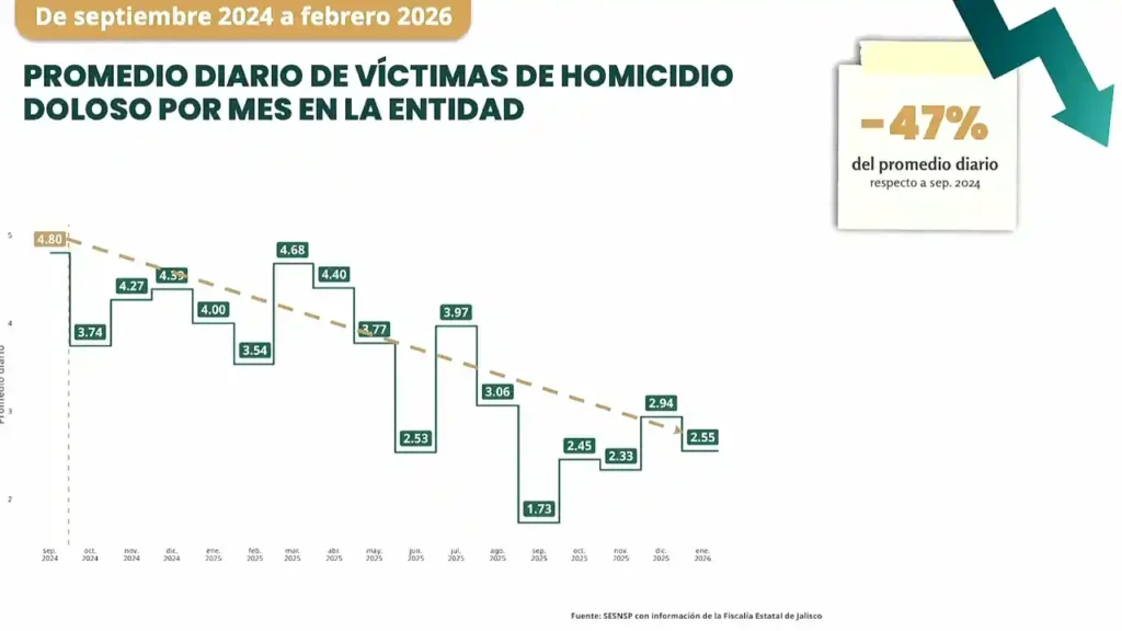 La titular del Secretariado Ejecutivo del Sistema Nacional de Seguridad Pública, Marcela Figueroa, informó que en el estado de Jalisco se registró una disminución del 47% en homicidios dolosos entre septiembre de 2024 y enero de 2026.