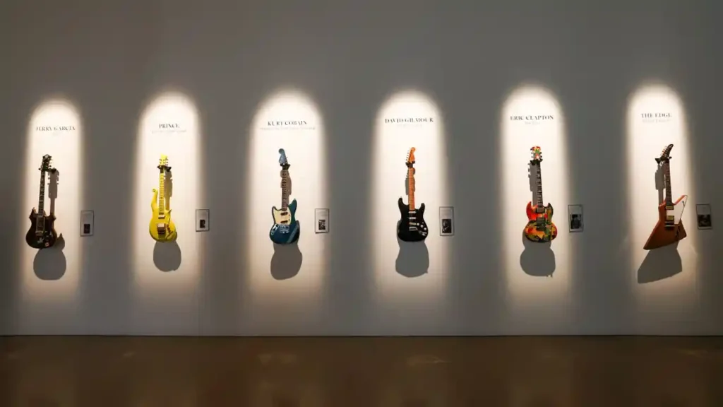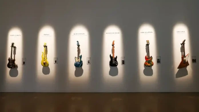 La colección incluye guitarras de músicos que definieron el siglo XX, incluyendo a David Gilmour de Pink Floyd y Jerry García de The Grateful Dead, así como de Eric Clapton, John Coltrane y Johnny Cash.