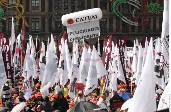 El 5 de octubre y el 6 de diciembre del año pasado los históricos líderes del sindicalismo “charro” movilizaron a miles para llenarle la plaza a la Mandataria, en los festejos de su primer año de Gobierno y de los 7 años de la Cuarta Transformación.