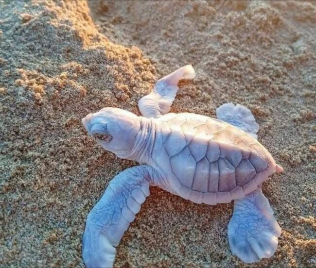 Durante el monitoreo rutinario de la eclosión de un nido, el personal del campamento notó la presencia de una cría de tortuga negra (Chelonia mydas) con una tonalidad blanca en gran parte de su cuerpo, una característica que la distingue notablemente del resto de las crías.